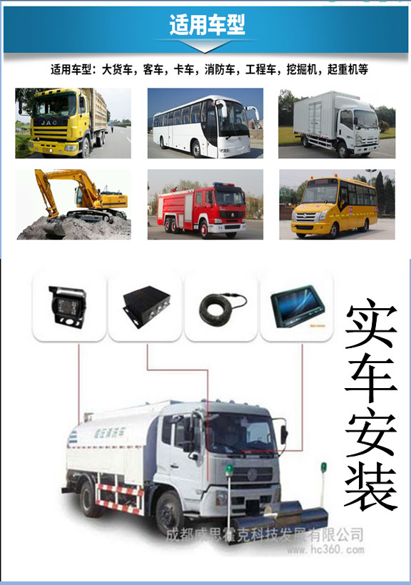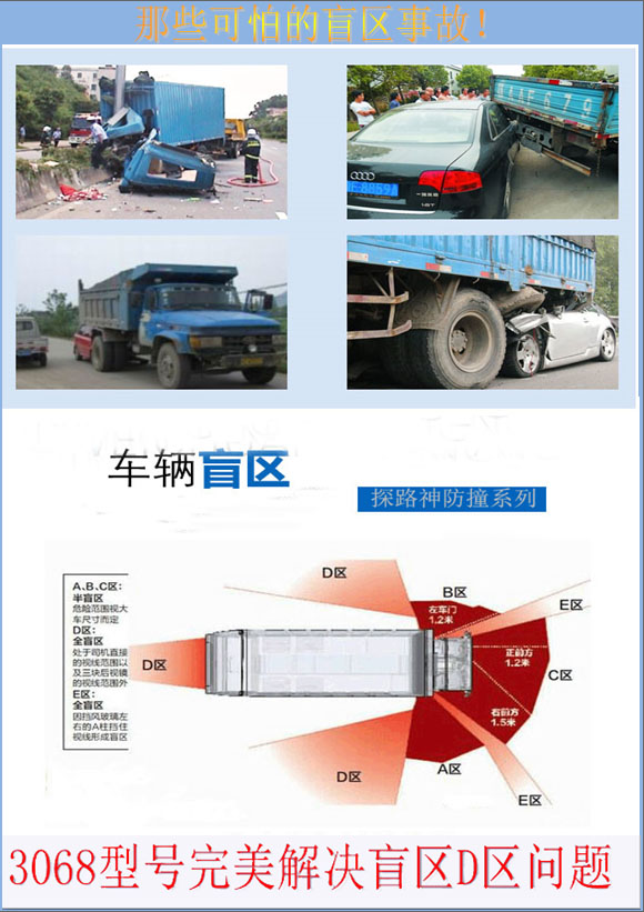 本产品是针对大型卡车货车的倒车视野不好的环境设计和制作的可视倒车雷达。通过摄像头将车后环境通过视屏直接显示到显示屏上,让驾驶员直观了解车后环境;另外,超声波探头精确探测车后障碍物距离,并且在显示屏显示距离并发出其它警示信号。从而使驾驶者在探测范围内能方便地判断车后障碍物的距离、方位和所在区域,得到及时警示,达到安全倒车的目的。