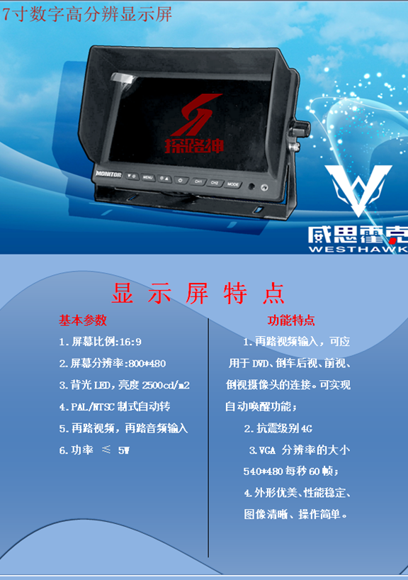 CT-3068-6S-N8 基本参数 探测范围: 0.3~3.5/5.0m 基本配置: 主机、7寸高清数字显示屏、探头、摄像头 报警提示: 实物影像+蜂鸣提醒 探头: 6 个 产品重量: 1200g 产品产地: 四川成都 详细说明 倒车雷达、货车可视倒车雷达。本产品是针对大型卡车货车的倒车视野不好的环境设计和制作的可视倒车雷达。通过摄像头将车后环境通过视屏直接显示到显示屏上,让驾驶员直观了解车后环境;另外,超声波探头精确探测车后障碍物距离,并且在显示屏显示距离并发出其它警示信号。从而使驾驶者在探测范围内能方便地判断车后障碍物的距离、方位和所在区域,得到及时警示,达到安全倒车的目的。此款产品具有防水、防震、防干扰,探测距离远等优点